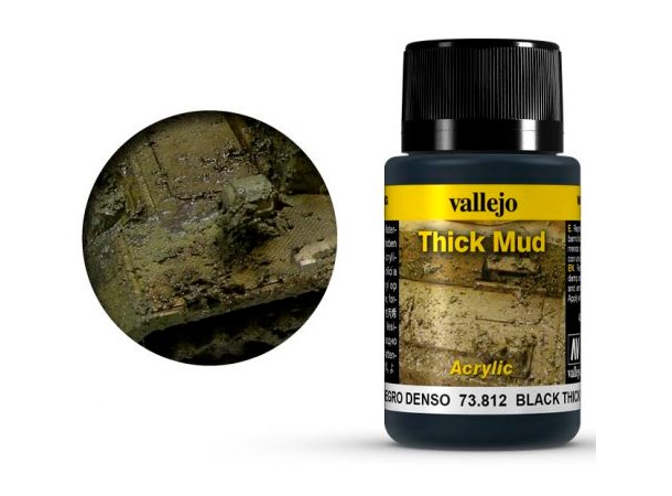 Vallejo Thick Mud-serien är utformad för att återskapa effekten av tjock och tung lera, perfekt för att återge terräng på vinjetter eller dioramor, liksom texturer på bil- eller lastbilsrattar, undervagnar och ackumulerad lera på tankbälteshjul. Resterna av växtlighet som ingår i vissa av dessa produkter ger modellen en extra realistisk känsla.
