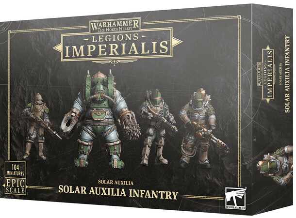Med denna plastsats i flera delar kan du bygga 104 episka Solar Auxilia-miniatyrer, fördelade på 26 baser. Från lasergevärsbeväpnade tercios av Auxilia-trupper till elitaxelsvingande Veletarii, Solar Auxilia står redo att erövra och hålla sin mark genom strikt disciplin och rent antal. Med stöd av likasinnade Legate Commanders, flame teams, de massiva Charonite Ogryns och Aethon Heavy Sentinels utgör de ett dödligt slag för alla som underskattar värdet av dödliga soldater.